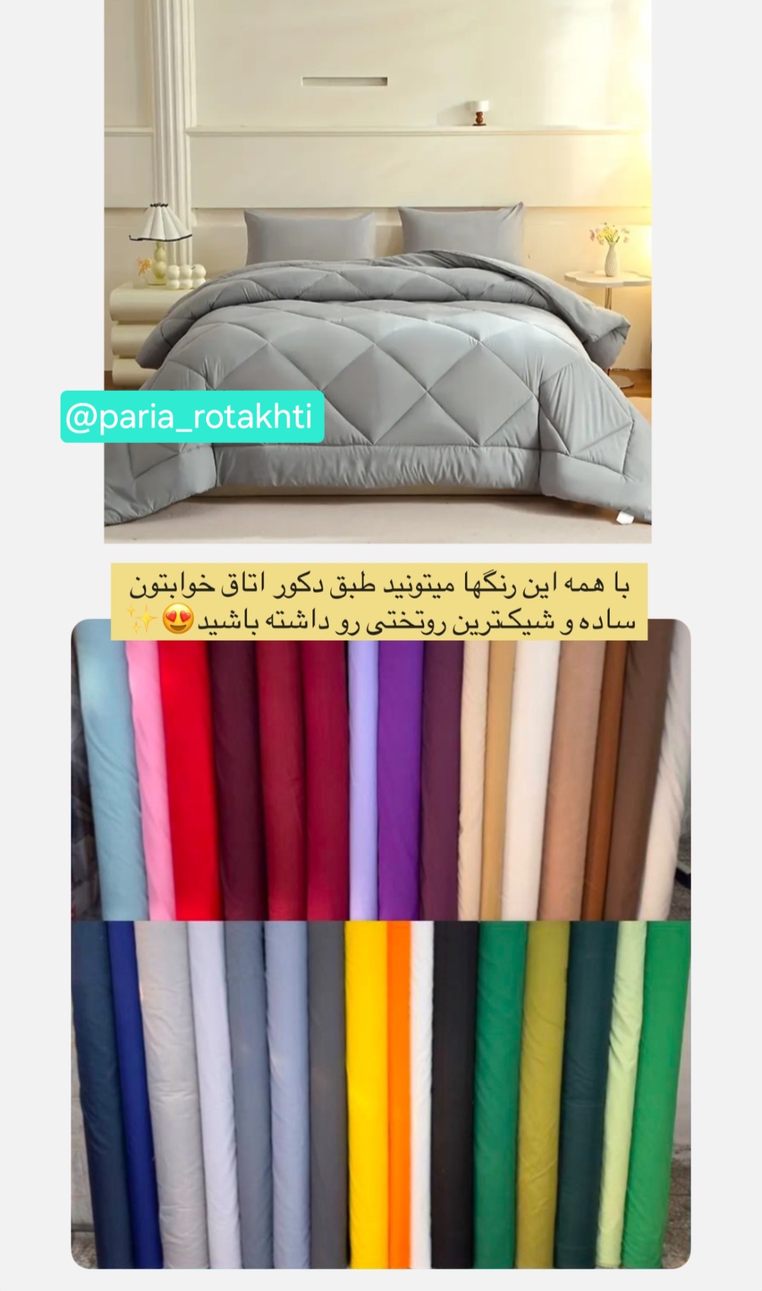 روتختی های میکرو پنبه ساده ولی شیک و پر طرفدار لذت خرید بدون واسطه موجود در ۳۳ رنگ متفاوت و زیبا جنسش میکرو براش بسیار نرم و لطیف بالاترین کیفیت زیر بازار بخرید خوشحال میشم کنید قيمت ها رو مقایسه کنید قابل در هر سایزی ۲تا ۶ روز کاری بعد از ثبت ارسال میشود آیدی پیج: @paria_rotakhti دونفره شش تیکه یک عدد لحاف دورو220240 یک عدد ملافه کشدار تشک دوعدد روبالشی 5070 دوعدد روکوسنی 4040 با ضمانت شستشو تکنفره چهار تیکه یک عدد لحاف دورو220160 یک عدد ملافه کشدار تشک دوعدد روبالشی طرح دار 5070